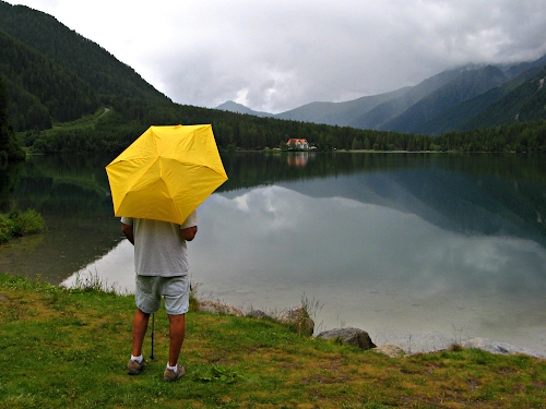 Foto dell'autore mavi80 candidata al contest fotografico parapioggia su Dizy. Data inserimento: mercoledì 12 novembre 2025. Titolo: Ombrello giallo sul lago di Anterselva