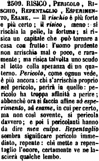 Risico, Pericolo, Rischio, Repentaglio, Esperimento, Esame - Il rischio è più forte e più certo; il risico, meno: si rischia la pelle, la fortuna; si risica un capitale che può tornare a casa con frutto: l'uomo prudente non arrischia mai o poco, e raramente; ma risica talvolta uno scudo al lotto colla speranza di un quaterno. Pericolo, come ognun vede, è più ancora: chi s'arrischia proprio nel pericolo, perirà in quello: pericolo ha troppa affinità a perire; abbenchè ora si faccia affine ad esperimento, ad esame, in cui per certo, ma non così sovente, si pericola davvero; e poi i pericolanti hanno da dire mea culpa. Repentaglio sembra significare pericolo immediato, repente: chi mette a repentaglio l'onore, certamente ve ne lascierà qualche lembo. [immagine]