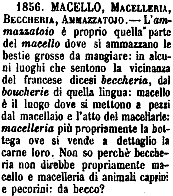 | Macello, Macelleria, Beccheria, Ammazzatojo - L'ammazzatorio è proprio quella parte del macello dove si ammazzano le bestie grosse da mangiare: in alcuni luoghi che sentono la vicinanza del francese dicesi beccheria, dal boucherie di quella lingua: macello è il luogo dove si mettono a pezzi dal macellaio e l'atto del macellarle: macelleria più propriamente la bottega ove si vende a dettaglio la carne loro. Non so perchè beccheria non direbbe propriamente macello e macelleria di animali caprini e pecorini: da becco? [immagine] |
