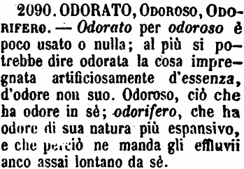 Odorato, Odoroso, Odorifero - Odorato per odoroso è poco usato o nulla; al più si potrebbe dire odorata la cosa impregnata artificiosamente d'essenza, d'odore non suo. Odoroso, ciò che ha odore in sè; odorifero, che ha odore di sua natura più espansivo, e che perciò ne manda gli effluvii anco assai lontano da sè. [immagine]