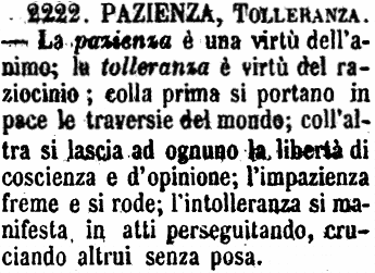 | Pazienza, Tolleranza - La pazienza è una virtù dell'animo; la tolleranza è virtù del raziocinio; colla prima si portano in pace le traversie del mondo; coll'altra si lascia ad ognuno la libertà di coscienza e d'opinione; l'impazienza freme e si rode; l'intolleranza si manifesta in atti perseguitando, cruciando altrui senza posa. [immagine] |