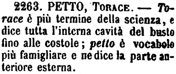 Petto, Torace - Torace è più temine della scienza, e dice tutta l'interna cavità del busto fino alle costole; petto è vocabolo più famigliare e ne dice la parte anteriore esterna. [immagine]