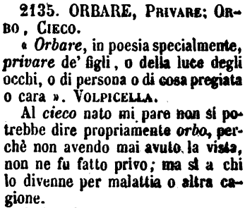 Orbare, Privare; Orbo, Cieco - « Orbare, in poesia specialmente, privare de' figli, o della luce degli occhi, o di persona o di cosa pregiata o cara ». Volpicella.
