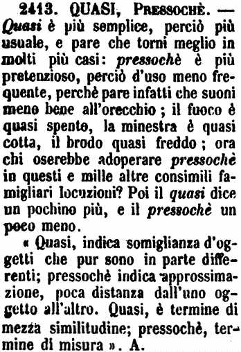«Quasi, indica somiglianza d'oggetti che pur sono in parte differenti; pressochè indica approssimazione, poca distanza dall'uno oggetto all'altro. Quasi, è termine di mezza similitudine; pressochè, termine di misura». A. [immagine]