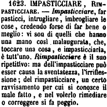 | Impasticciare, Rimpasticciare - Impasticciare, far pasticci, intrugliare, imbrogliare le cose, credendo forse di far bene o meglio: vi son di quelli che hanno una mano così malaugurata, che, toccare una cosa, e impasticciarla, è tutt'uno. Rimpasticciare è il suo ripetitivo: ma dell'impasticciare può esser causa la sventatezza, l'irriflessione; del rimpasticciare, un certo ravvisamento per cui si conosce il male fatto, e nel volerlo rimediare o correggere si fa peggio. [immagine] |