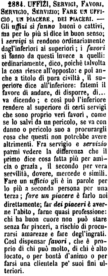 Uffizi, Servigi, Favori, Servigio, Servizio; Fare un ufficio, Un piacere, Dei piaceri - Gli uffizi si fanno buoni o cattivi, ma per lo più si dice in buon senso; i servigi si rendono ordinariamente dagl'inferiori ai superiori; i favori si fanno da questi invece a quelli: ordinariamente, dico, poichè talvolta la cosa riesce all'opposto: e poi anche a titolo di pura civiltà, il superiore dice all'inferiore: fatemi il favore di andare, di disporre, di... va dicendo; e così può l'inferiore rendere al superiore di certi servigi che sono proprio veri favori, come se lo salvi da un pericolo, se va con danno o pericolo suo a procurargli cosa che questi non potrebbe avere altrimenti. Fra servigio e servizio parmi vedere la differenza che il primo dice cosa fatta più per amicizia o grazia, il secondo per vera servilità, dovere, mercede e simili. Fare un ufficio gli è in parole per lo più a seconda persona per una terza; fare un piacere è farlo noi direttamente; far dei piaceri è averne l'abito, farne quasi professione: chi ha buon cuore non può stare senza far piaceri, a rischio di procurarsi amarezze e fare degl'ingrati. Così dispensar favori, che è proprio di chi può molto, di chi è alto locato, o per bontà d'animo o per farsi una clientela pe' suoi fini ulteriori. [immagine]